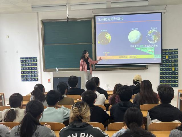 王丹老师从达尔文进化论、生命的组成、45亿年前陆地的景观和人类的祖先四个方面为同学们讲解了生命的起源与演化。王丹老师运用生动图片、详实数据及丰富案例,特别是有趣的动物演化过程,引领学生沉浸于地理知识,领略生命起源的壮美。